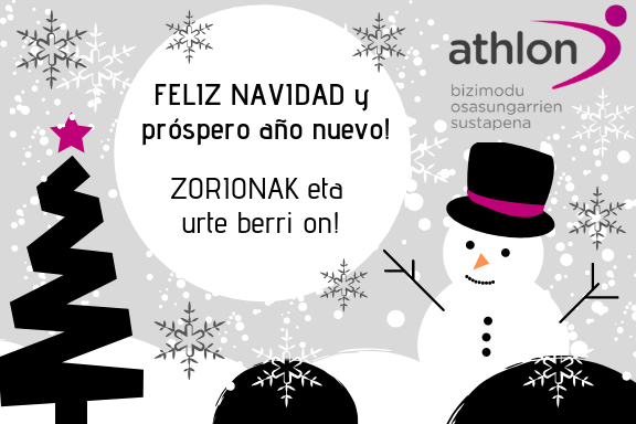 Athlon osatzen dugunon desioa da Gabon Zoriontsuak izan daitezela guztiontzat eta urte berria ilusioz josita etorri dadila. —————————- De parte de todas las personas que componemos Athlon, os deseamos unas Felices Fiestas y que el año nuevo venga cargado de nuevas ilusiones para todos y todas.